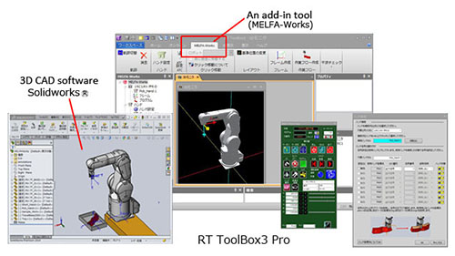 RT ToolBox3 PRO is a 3D robot simulator that provides powerful support for system designs and preliminary layout examinations. It allows robot simulations to be run in SolidWorks® 3D CAD software. Programs can be created to match today’s era of high-mix, low-volume production, such as for layout considerations prior to introducing robots, desktop program debugging, and generation of complex motion paths.