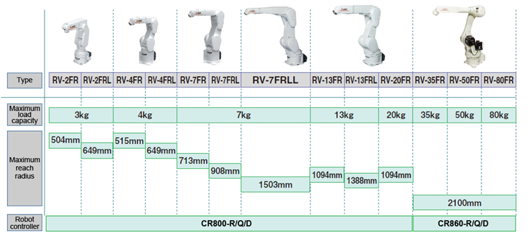RV-FR robots are available in load capacities from 2kg to 20kg, with reach radii ranging from 504mm to 1,094mm.